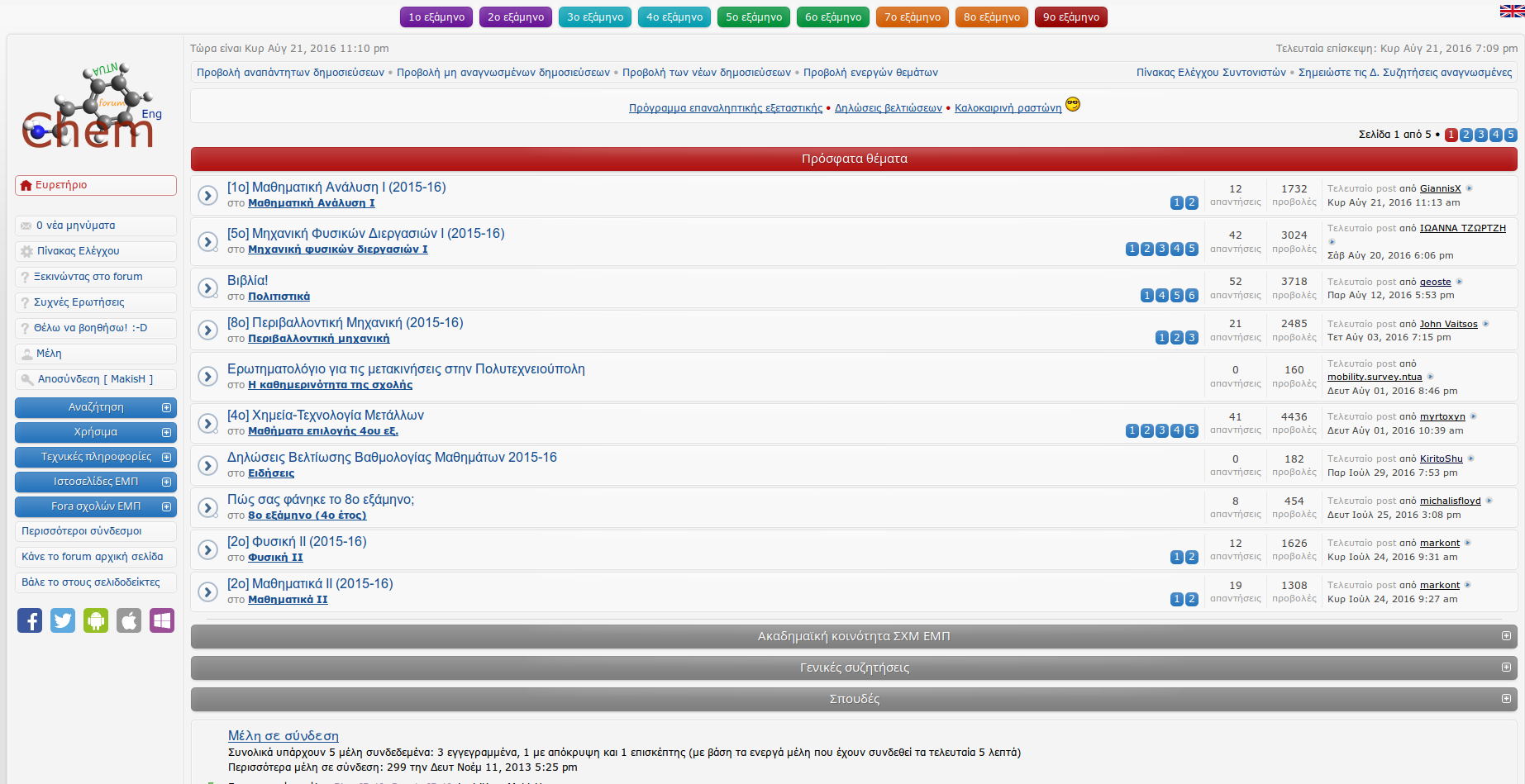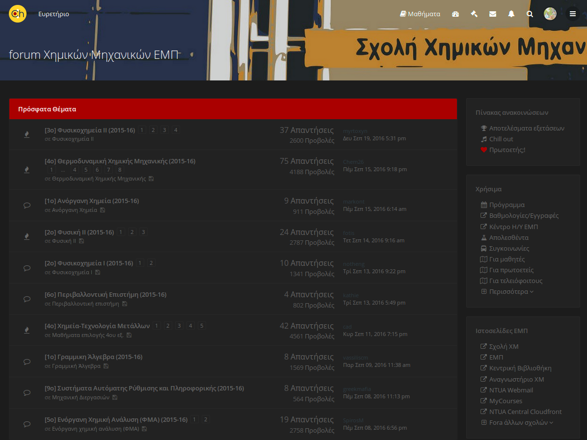 ChemEng NTUA έκδοση 4η 1 από MakisH Η 4η έκδοση του Forum είναι εδώ με νέες λειτουργίες και μερικές αλλαγές! Ας αρχίσουμε με το (μόνο) κακό νέο: Απενεργοποιήθηκε η λειτουργία των "ευχαριστώ" (likes), τουλάχιτον προσωρινά, καθώς δεν υποστηρίζεται ακόμα στη νέα έκδοση του phpBB (θα υποστηρίζεται πιθανότατα στην επόμενη). Κρατήσαμε τα δεδομένα και ίσως στο μέλλον την ενεργοποιήσουμε ξανά. Πολλά καλά νέα! 1. Νέα εμφάνιση, όπως θα είδατε ήδη! Αυτή τη φορά αγοράσαμε ένα "style" το οποίο ελπίζουμε να έχει καλή υποστήριξη στο μέλλον για να μην αλλάξουμε ξανά. Παρεμπιπτόντως, έχουν μαζευτεί πολλά έξοδα και θα εκτιμούσαμε μια βοήθεια! Αν θέλετε μπορείτε να συνεισφέρετε απευθείας με Paypal ή κάρτα (ωστόσο κρατάει προμήθεια κάπου 10%). Σε κάθε περίπτωση, στείλτε και ένα προσωπικό μήνυμα στους συντονιστές! 2. Αν βρίσκετε το forum πολύ φωτεινό, πλέον μπορείτε να επιλέξετε μια σκοτεινή έκδοση! Σημειώστε πως θέλει βελτίωση ακόμα, βοηθήστε μας αναφέροντας προβλήματα! Δείτε πώς να το ενεργοποιήσετε: Κάντε κλικ στην εικόνα προφίλ σας (πρέπει να είστε συνδεδεμένοι) "Πίνακας Ελέγχου Μέλους" "Προτιμήσεις Δ. Συζήτησης" "Επεξεργασία γενικών ρυθμίσεων" > "Το στυλ μου" > "Ravaio-dark" "Υποβολή" Πώς να αλλάξετε σε dark theme 3. Νέα έκδοση του phpBB με νέες λειτουργίες, όπως σύστημα ειδοποιήσεων για τα θέματα που σας ενδιαφέρουν. 4. Πλέον χρησιμοποιείται το ίδιο (responsive) στυλ για υπολογιστές και κινητά, ελπίζουμε αυτό να σας βολέψει! Σημειώστε πως σε οθόνες χαμηλής ανάλυσης (<700px πλάτος ή <650px ύψος) το μενού μαθημάτων που βρίσκεται στο πάνω μέρος της οθόνης μετατρέπεται αυτόματα σε ένα link προς τις "καρτέλες μαθημάτων". Αυτό επηρεάζεται και από τη λειτουργία zoom-in του browser σας. 5. Πολλές αλλαγές στο "παρασκήνιο" που κάνουν αρκετά ευκολότερη τη διαχείριση σε βάθος χρόνου. Μέσα στις επόμενες μέρες θα υπάρξουν μικρορυθμίσεις και ενδεχομένως κάποιες νέες λειτουργίες που πρέπει να δούμε πρώτα λίγο πιο προσεκτικά. Σύντομα θα δείτε και τα αποτελέσματα του ερωτηματολογίου, τα οποία παρεμπιπτόντως μας βοήθησαν πολύ! Πρώτα όμως ένα διάλειμμα! Απολαύστε! ΥΓ: Για να μαθαίνουν οι νεότεροι και να θυμούνται οι παλιότεροι, δείτε μερικά στιγμιότυπα από προηγούμενες εκδόσεις/εκδοχές του Forum: Τελευταία επεξεργασία από το μέλος MakisH την Σάβ 24 Σεπ 2016, 10:38 pm, έχει επεξεργασθεί 10 φορές συνολικά. ======> Βοηθήστε στο forum! <====== Συνημμένα Πώς να αλλάξετε σε dark theme (Βήμα 1) Πώς να αλλάξετε σε dark theme (Βήμα 2) Πώς να αλλάξετε σε dark theme (Βήμα 3) Πώς να αλλάξετε σε dark theme (Βήμα 4) 1η εποχή: 2010 2η εποχή: 2010-2013 3η εποχή: 2013-2016 ΠαράθεσηΣάβ 24 Σεπ 2016, 9:55 pm