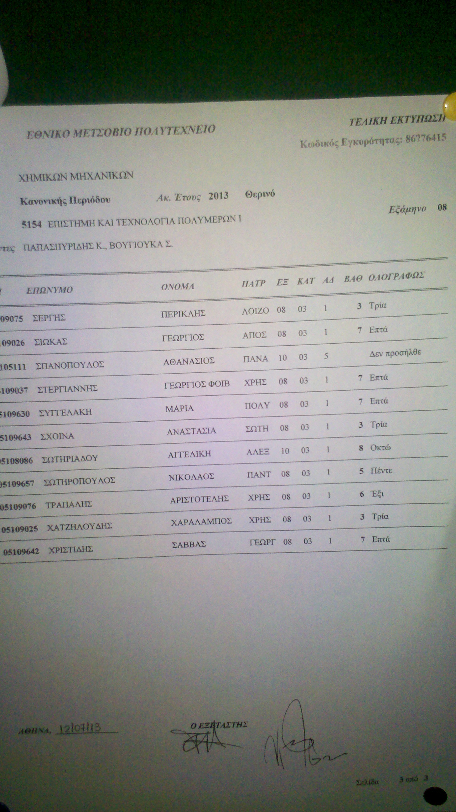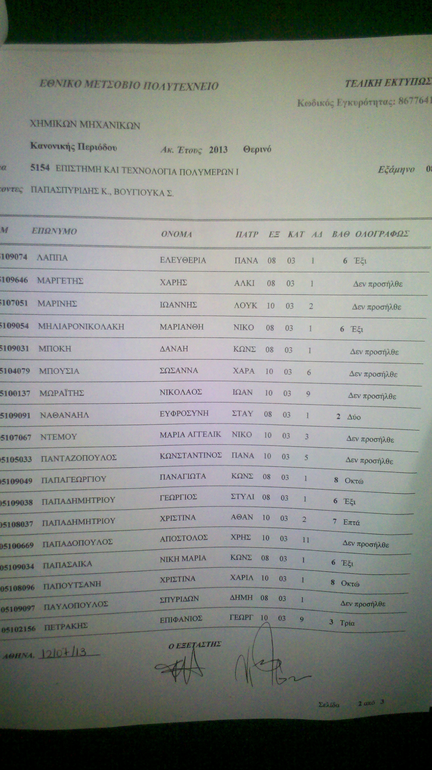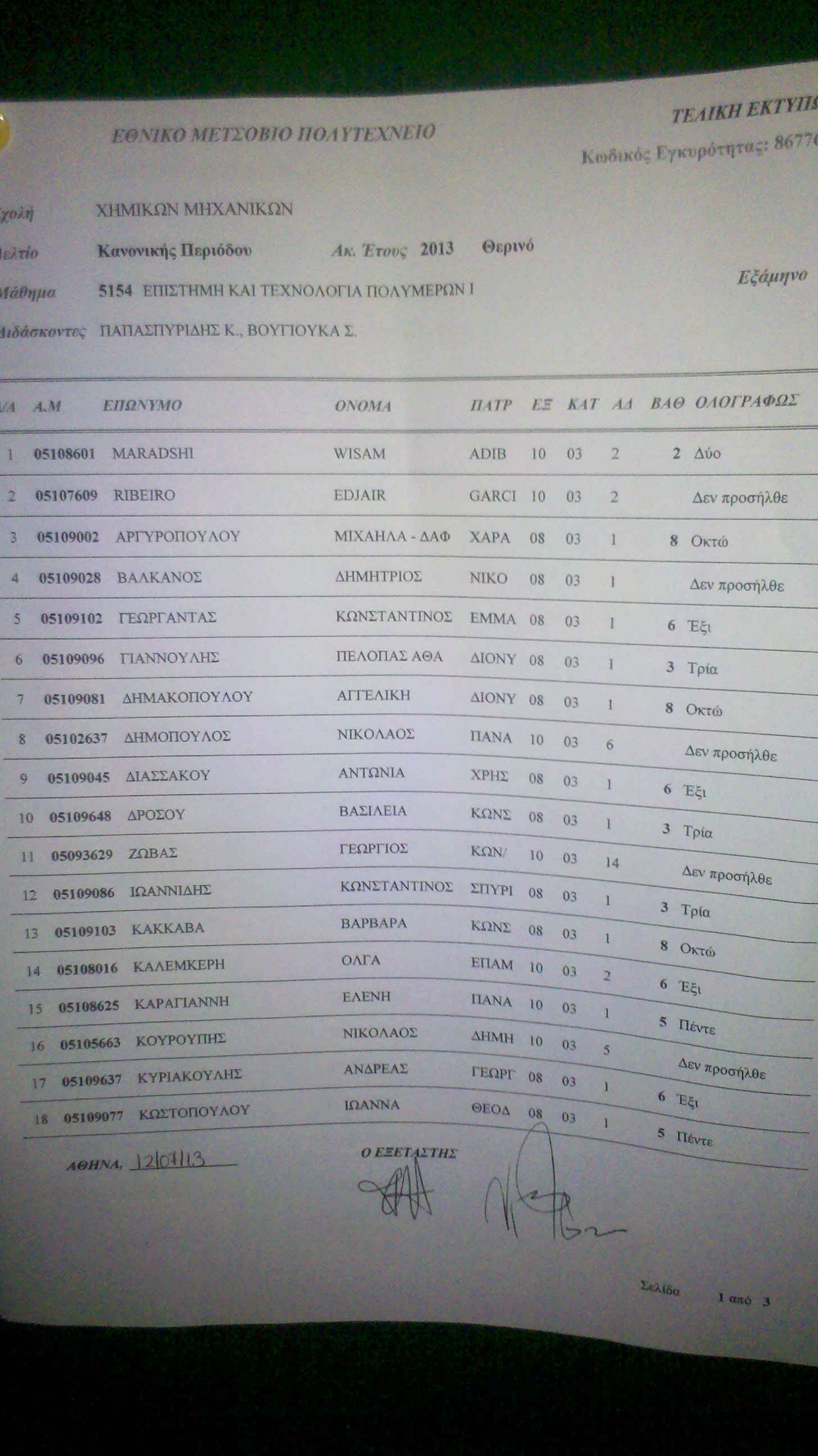 Επιστήμη και Τεχνολογία Πολυμερών I (8ο εξάμηνο) 25 από ob-la-da Τα αποτελέσματα βρίσκονται και αναρτημένα στο πίνακα ανακοινώσεων έξω από το εργαστήριο. Συνημμένα ΠαράθεσηΤετ 17 Ιούλ 2013, 4:50 pm