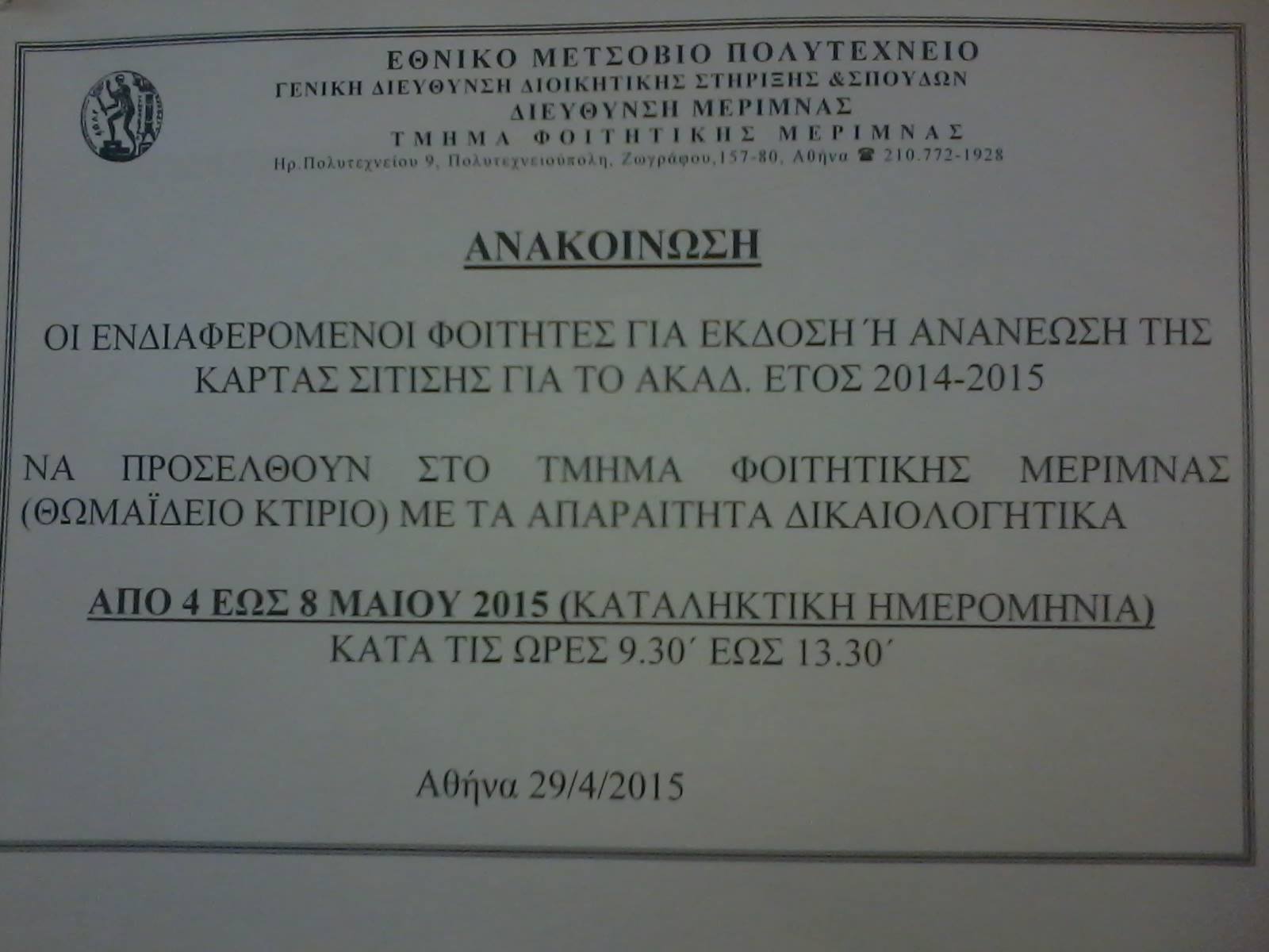 Re: Εστιατόρια ΕΜΠ - κάρτα σίτισης 28 από a9hna Γνωρίζει κανείς ποια είναι τα απαραίτητα δικαιολογητικά; ΠαράθεσηΠαρ 01 Μάιος 2015, 9:08 pm
