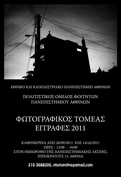 Re: Φωτογραφική λέσχη ΕΚΠΑ (ΠΟΦΠΑ) 29 από MakisH Εγγραφές Φωτογραφικού τομέα ΠΟΦΠΑ 2012-13 Καθημερινά από 24/9/2012 έως 12/10/2012 ώρες 12:00-17:00 στον ημιόροφο της Πανεπιστημιακής Λέσχης Ιπποκράτους 15 (Ιπποκράτους και Ακαδημίας) Μπορεί να γραφτεί οποιοσδήποτε (ακόμα και μη φοιτητές). Απλώς γράφεις το όνομά σου σε ένα βιβλίο και δίνεις μια μικρή συμβολή (10€) για τα χημικά του σκοτεινού θαλάμου κτλ. Μαθήματα (τεχνικά, από το μηδέν), σχολιασμός φωτογραφιών, σκοτεινός θάλαμος, φωτογραφικές βόλτες στην Αθήνα σε μια μεγάλη παρέα! Για κοπιάστε! edit: Επίσης, υπάρχει και έκθεση φωτογραφίας στο ΚΕΘΕΑ ΔΙΑΒΑΣΗ: ======> Βοηθήστε στο forum! <====== ΠαράθεσηΤετ 26 Σεπ 2012, 1:41 pm