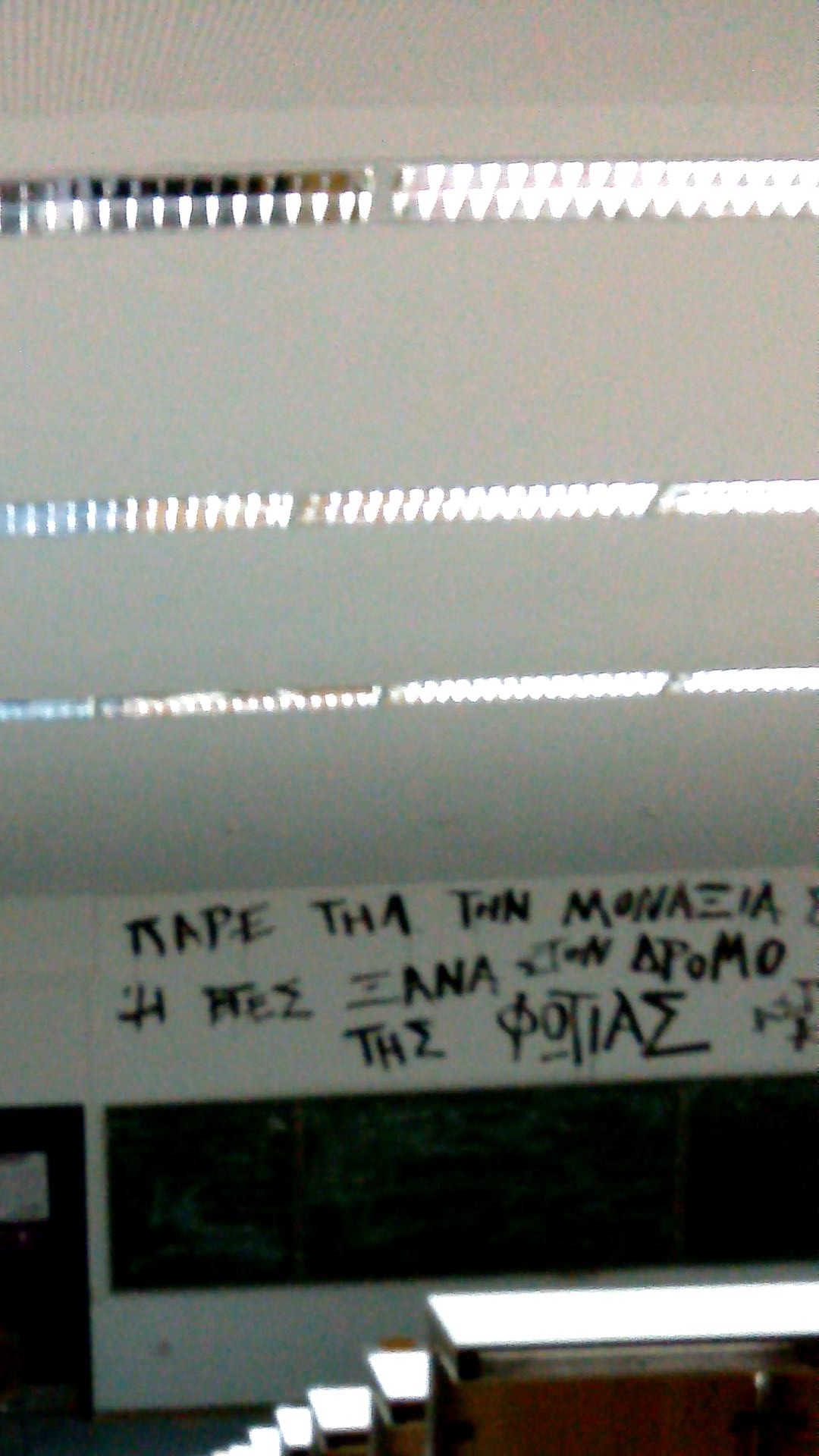 Είμαστε απλοί φοιτητές, και συγκεκριμένα ένα ετερόκλητο μίγμα φοιτητών από όλα τα έτη που καταλήξαμε στο ότι πρέπει να γίνει το αυτονόητο! Δηλαδή, οι χώροι διδασκαλίας να είναι χώροι διδασκαλίας Συνθήματα και άλλες μορφές γραπτής εκδήλωσης απόψεων δεν έχουν χώρο στις αίθουσες διδασκαλίας μας.