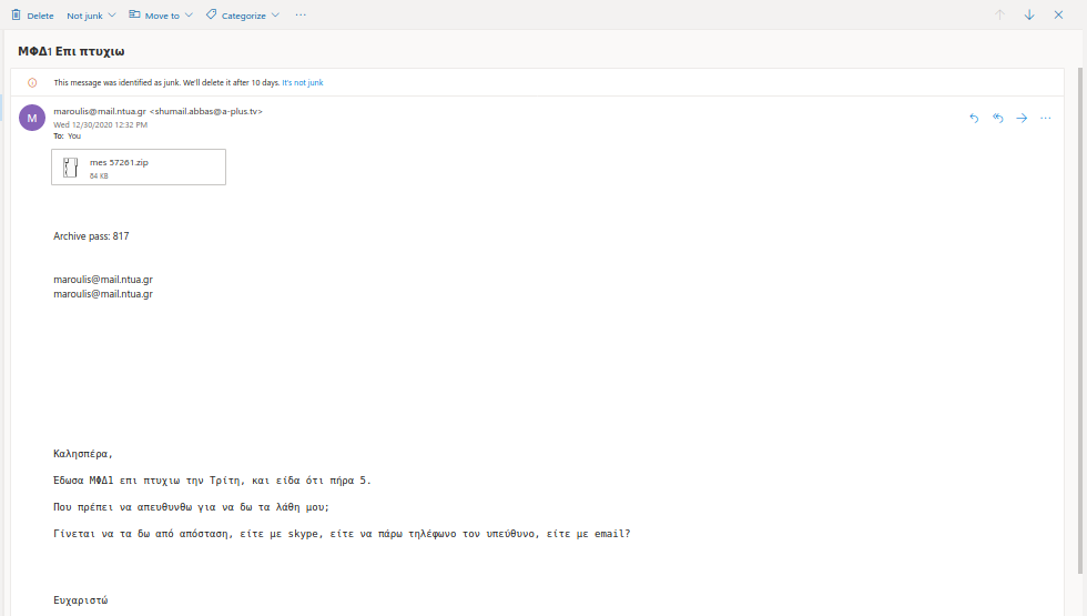 Ύποπτο mail με όνομα καθηγητή. 1 από tolis261995 Καλησπέρα, έλαβα σήμερα στον φάκελο junk mail με zip attachment, από άσχετη διέυθυνση mail, αλλά με όνομα σαν το μέιλ του Μαρούλη. Το περίεργο είναι οτι ήρθε ως απάντηση σε μέιλ που όντως είχα στείλει στον Μαρούλη πριν κάποιο καιρό, και περιλάμβανε το κείμενο του original μέιλ που του είχα στείλει. Οπότε εικάζω οτι παίζει να έχει παιχτεί κάποιο θέμα ασφαλείας. Προφανώς δεν άνοιξα ούτε κατέβασα το συνημμένο. Ενημέρωσα τον Μαρούλη, δεν έχω λάβει απάντηση ακόμα, αλλά εντωμεταξύ σκέφτηκα να το ανεβάσω και εδώ, μήπως έχει κάποιος ιδεα πιο συγκεκριμένα τι παίζει να είναι, αλλά και προς ενημέρωση σε περίπτωση που το λάβει κανείς άλλος. Επισυνάπτω Screenshot από το mail. ΠαράθεσηΤετ 30 Δεκ 2020, 4:31 pm