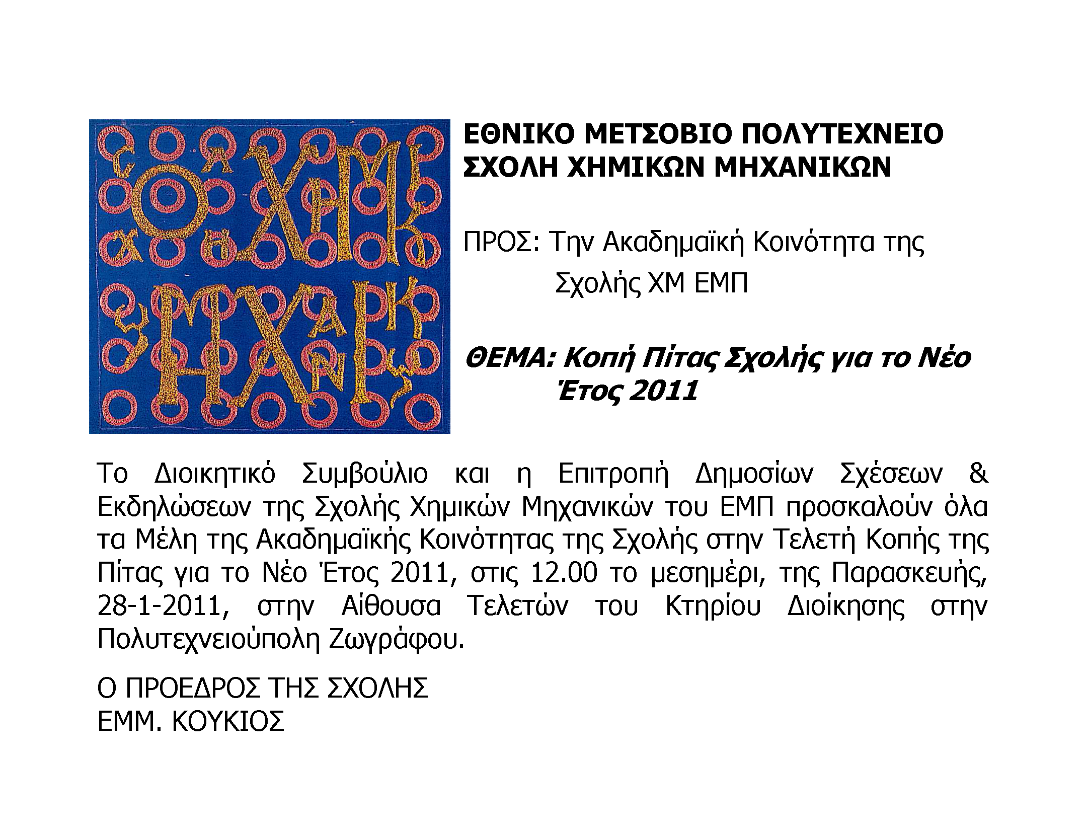 Κοπή πίτας 2011 της σχολής Χημικών μηχ. ΕΜΠ 1 από MakisH Την Παρασκευή 28/1/2011, στις 12:00, στην αίθουσα τελετών του κτιρίου διοίκησης θα γίνει η κοπή της βασιλόπιτας της σχολής μας για το νέο έτος.Πηγή Πρόσκληση για την κοπή πίτας ΣΧΜ 2011 ======> Βοηθήστε στο forum! <====== ΠαράθεσηΣάβ 22 Ιαν 2011, 6:19 pm